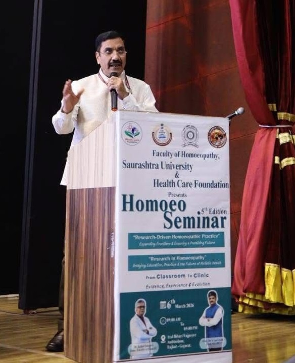 The program was graced by distinguished dignitaries including Prof. (Dr.) Utpal Joshi, Hon’ble Vice-Chancellor of Saurashtra University, Dr. Anil Khurana (Former Chairperson, NCH), Dr. Subhash Kaushik (DG, CCRH), Dr. Pinakin N. Trivedi (Former President, BERH), and Dr. Kalpit Sanghvi, Dean, Faculty of Homoeopathy. The seminar was held at the Atal Bihari Vajpayee Auditorium, Rajkot.